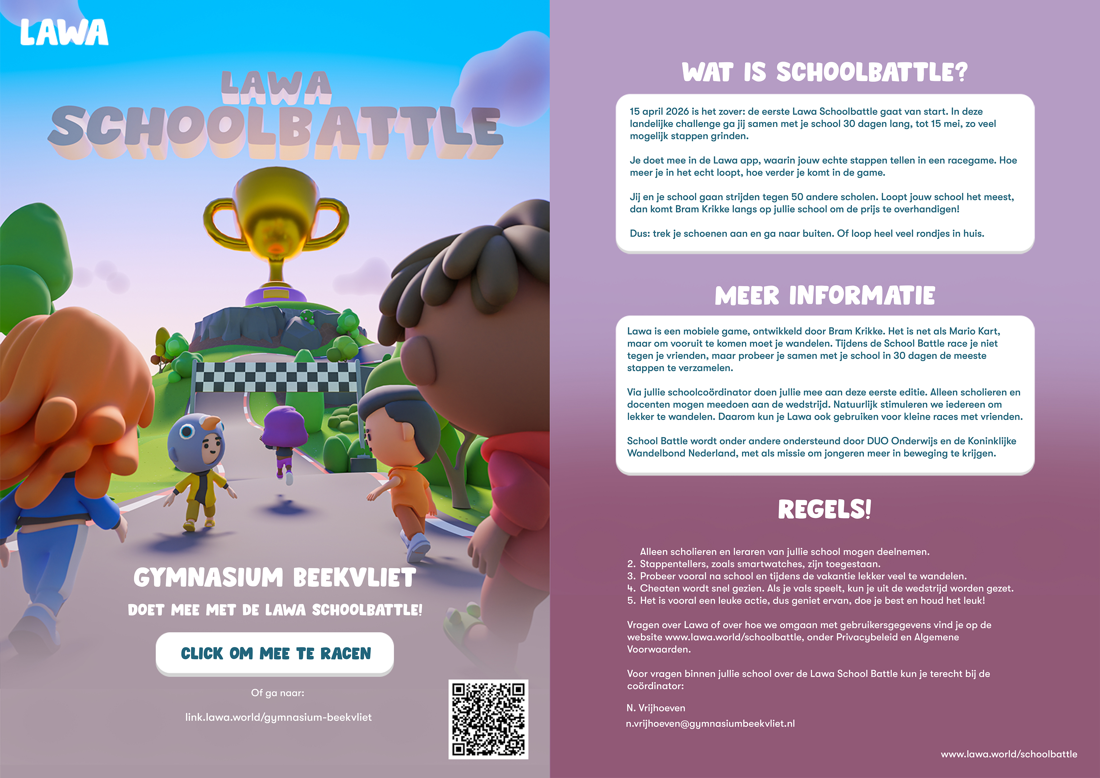 Dit jaar neemt Beekvliet deel aan de allereerste Lawa Schoolbattle 2026. Lawa en Bram Krikke organiseren samen met de Koninklijke Wandel Bond Nederland en DUO Onderwijsonderzoek een landelijke stappenchallenge voor middelbare scholen.